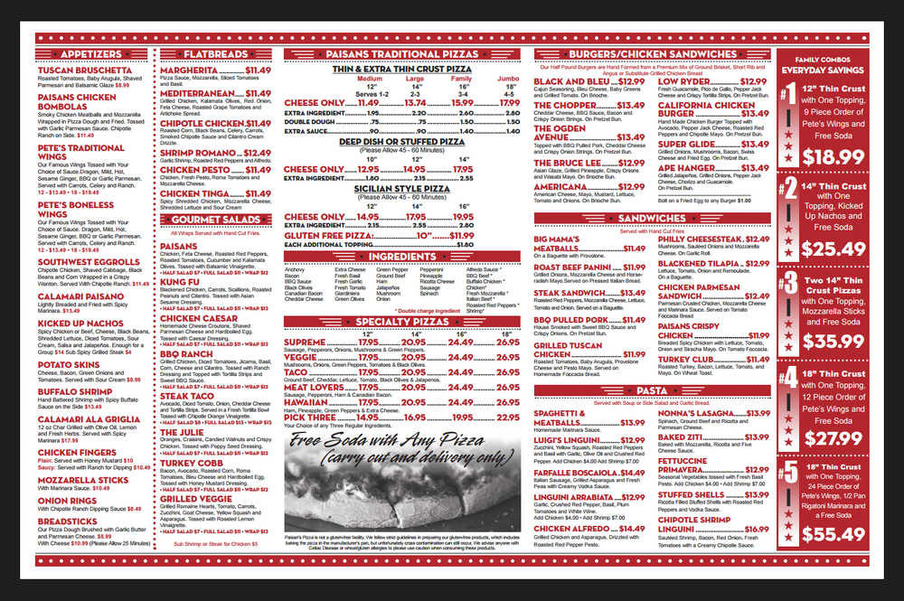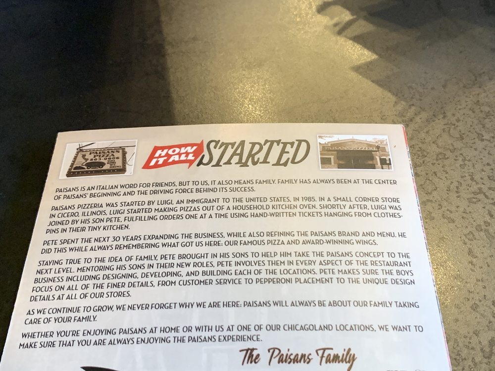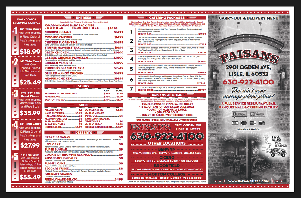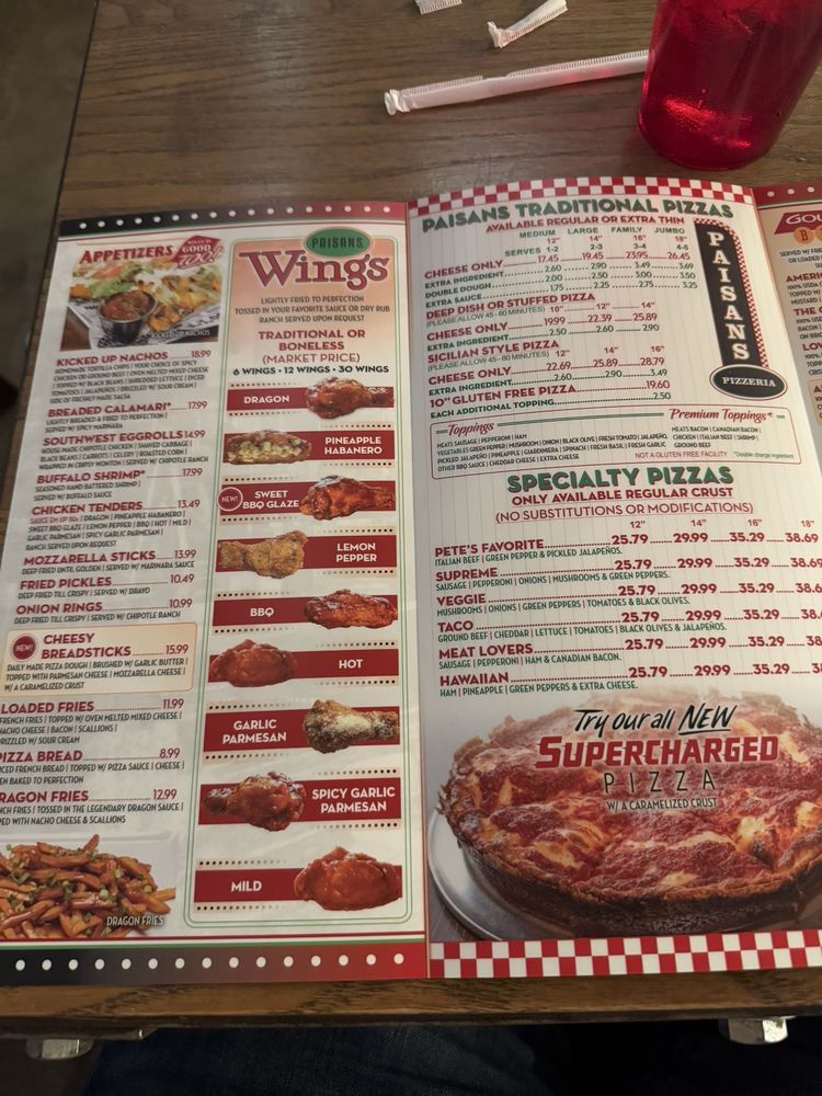 Paisans Pizzeria, located in Lisle, IL, is a Chicago chain known for its good food and inviting atmosphere. The menu features a variety of pizzas, sandwiches, and appetizers, with vegetarian options available. Customer reviews rave about the friendly staff and delicious dishes, such as Pete's Favorite pizza with Italian beef, green peppers, and jalapeños. The restaurant offers a unique experience with rotating fish tanks, a magician or balloon artist on Fridays, and a cozy, casual ambiance perfect for families and groups. The double dough pizza is a standout, with a sweet sauce and incredible crust, making it a must-try for pizza lovers. For a taste of neighborhood Italian charm and quality eats, Paisans Pizzeria is the place to be.